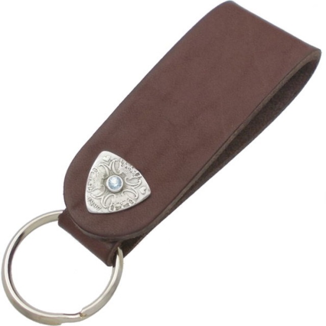 【素材:合金/レザー+シルバー】[要確認]メーカー取寄せ時2-4日/メーカー欠品時の納期約2週間(在庫、詳細納期は要問合せ) ★幸福を運ぶハートマークがポイントのデンマーククローネをアレンジしたレザーキーホルダー。 (全高105mm幅29mm、ニッケルキーリング30mm付、) 北欧の高福祉で国民の幸福感の高さでも知られるデンマーク、その「幸せを呼ぶコイン」と呼ばれるデンマーククローネをシルバー製コンチョに仕立てブラウンレザーのシックなループキーホルダーに合せた落ち着きのある組み合わせ。 誕生石が選べるのはモチロンのことブラック、イエローのジルコニアも選べシルバーの燻しとレザーのブラウンとのコンビで年齢を選ばずお勧めできるスタンダードなキーホルダーとして日常使いにオススメです。