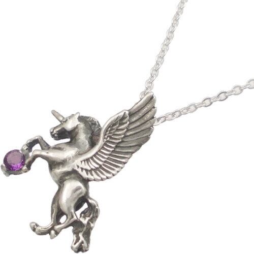 燻しの深い仕上げでアンティークな優雅で落ち着いたデザインに誕生石をセッティング。有翼のユニコーンはアリコーンやユニサスとも呼ばれ空想の生き物の中でも珍しい。バースデーストーンの他にもブラックとイエロージルコニアも用意好みのカラーでも選べる14色。