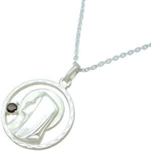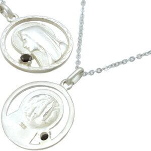 オーラをまとった聖母マリアをコインリングでデザインしたペンダント。誕生石が選べるのはモチロン、スッキリとした印象のホワイト仕上げと立体感のある陰影が魅力の燻し仕上げからも選べ仕上げ違いでのペアなどにもオススメのバリェーション。