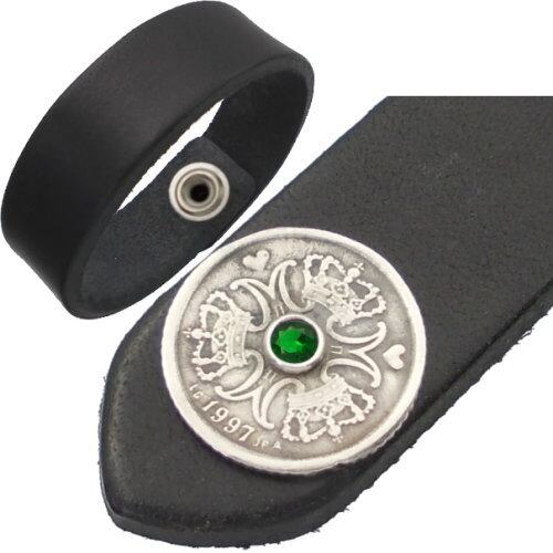 (5月)エメラルドグラス クローネ コイン ブラックレザーブレスレット 誕生石*BB-1002