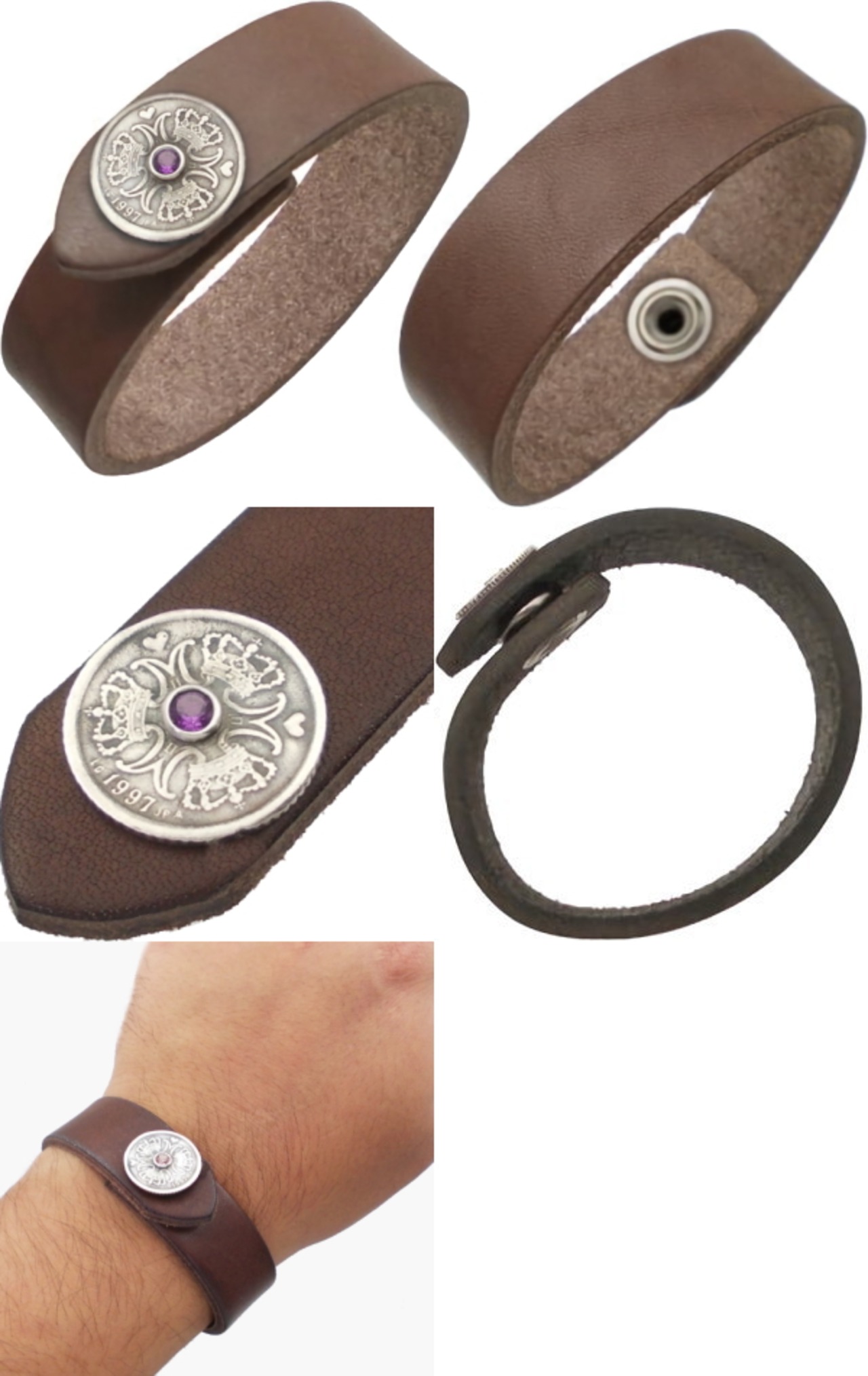 (2月)アメジスト クローネ コイン ブラウンレザーブレスレット 誕生石*BB-1003