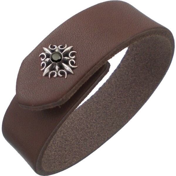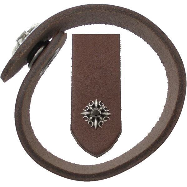 定番のモチーフを定番のゴシック調にアレンジしたクロスモチーフをシルバー製コンチョに仕立てたスタンダードスタイルのサドルレザーブレスレット。飽きのこないデザインはチョッとしたプレゼントにもオススメの王道。