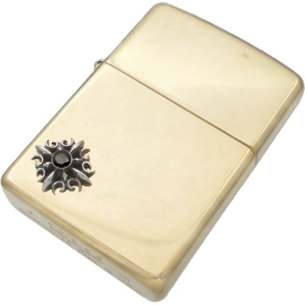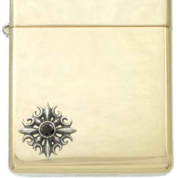 ★シルバーのシャープなクロスをスクロールの曲線で包んだブラスボディジッポ。