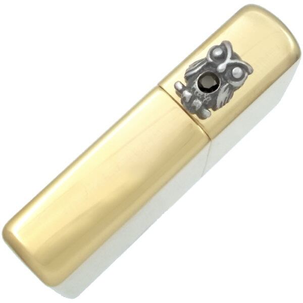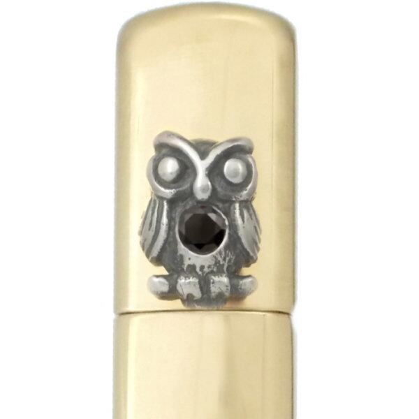 ★シルバーの愛らしいフクロウの胸に守られるバースデーストンが輝くブラスボディジッポ。