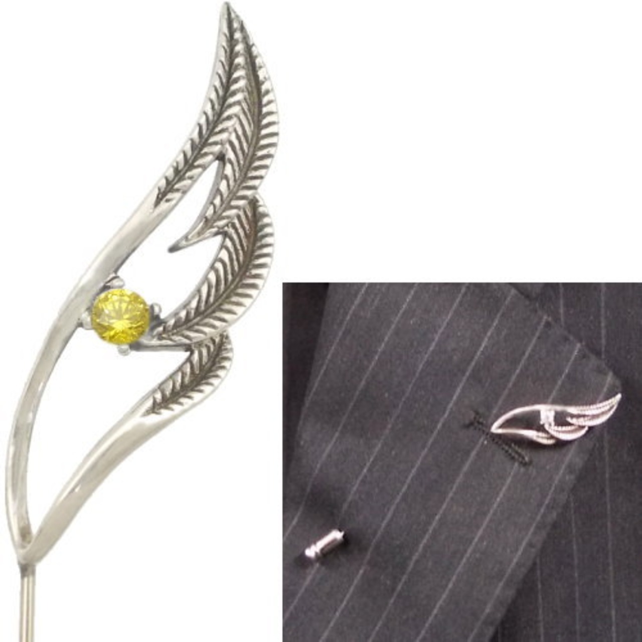 イエローC Z ブラック ラージ オープン フェザー シルバー ラペルピン△キュービックジルコニア使用*BK-1046