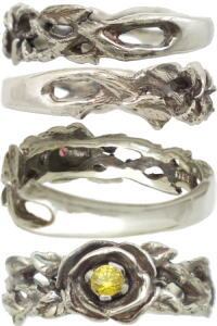 リアルに薔薇のツタが絡み合う繊細なデザインは燻し仕上げと相まってアンティークな落ち着きを放ちセンターストーンをより引き立ててくれる。センターに向かって逆台形状にバラが持ち上がっているのでよりモチーフ全体が立体的に見えるバランスも見事!