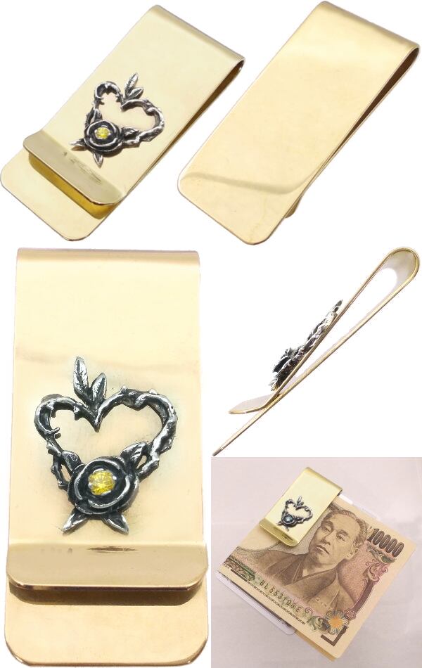 ★シルバーの薔薇とハートを美しくリース状に組み合わせたデザインが目を引くブラスマネークリップ。