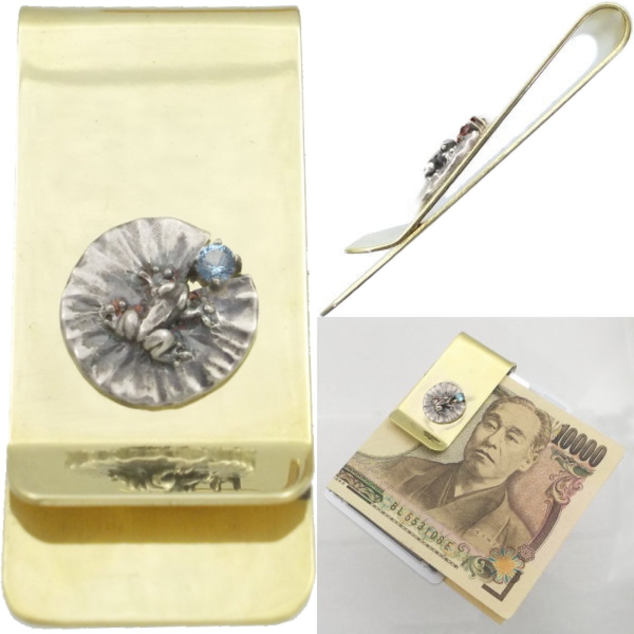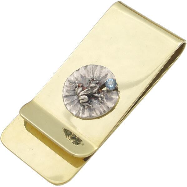 ★睡蓮の葉に張り付くシルバーのカエルとその切れ目に誕生石をセッティングしたブラスマネークリップ。