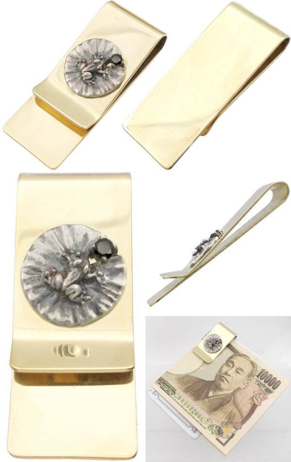 ★睡蓮の葉に張り付くシルバーのカエルとその切れ目に誕生石をセッティングしたブラスマネークリップ。