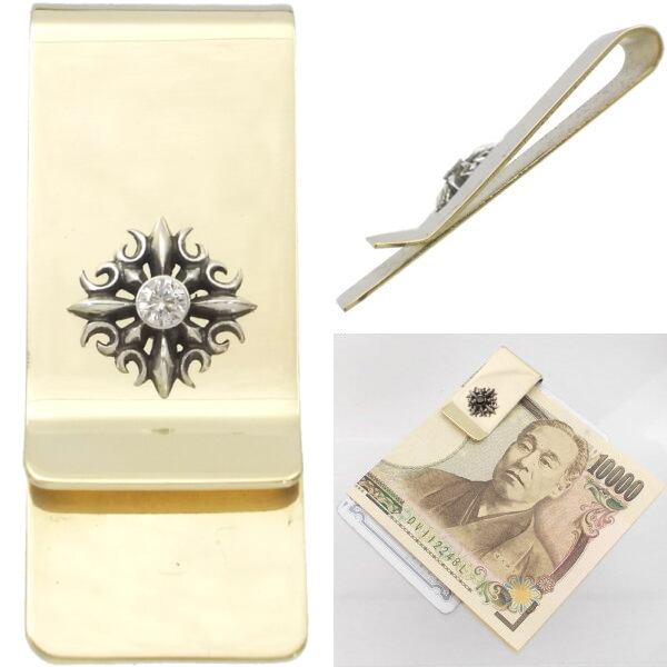 ★シャープなシルバーのクロスに誕生石をセッティングしたブラスマネークリップ。