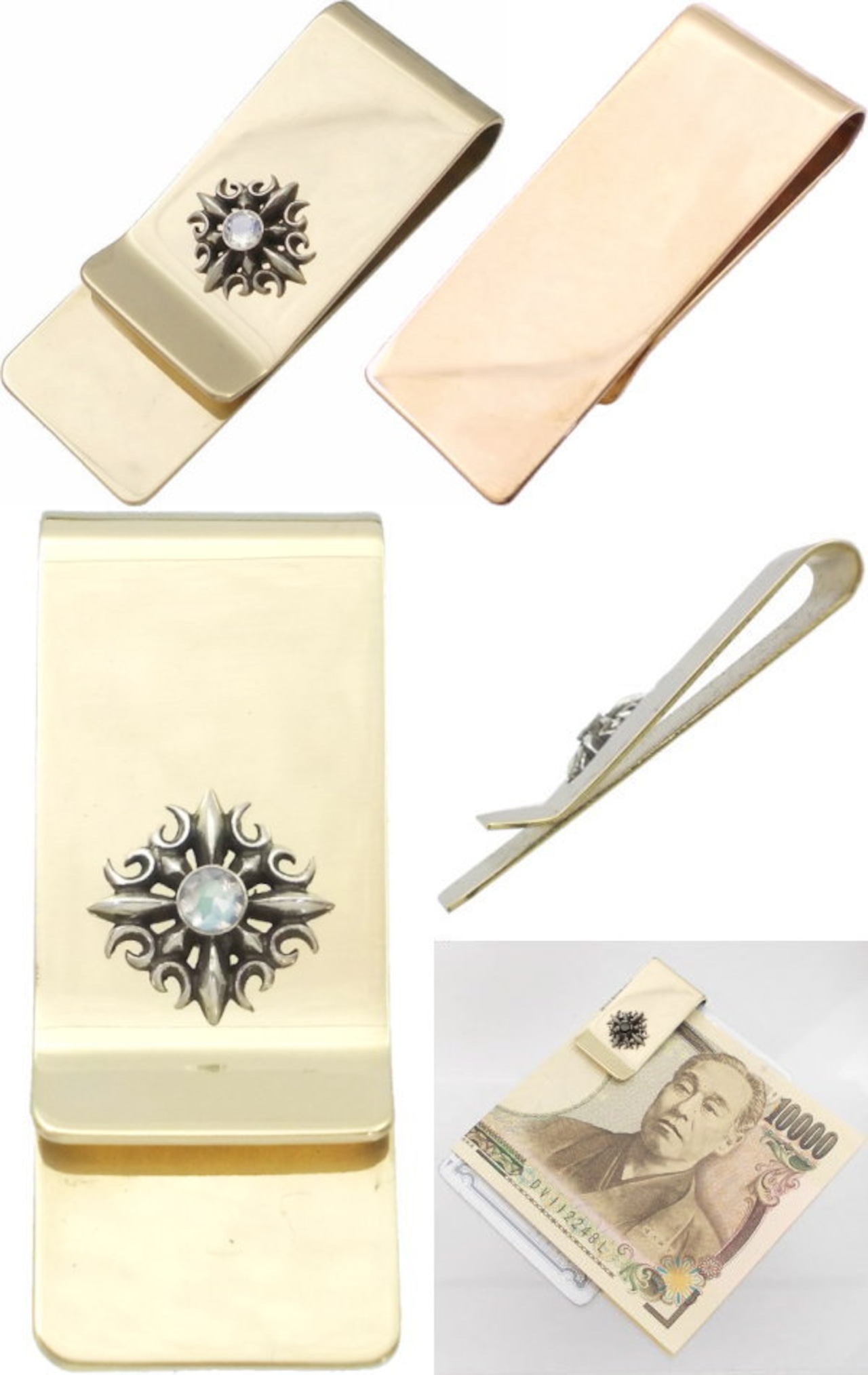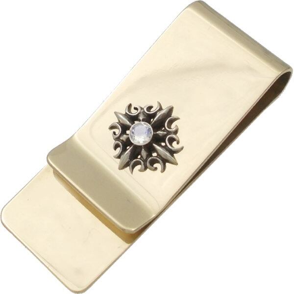 ★シャープなシルバーのクロスに誕生石をセッティングしたブラスマネークリップ。