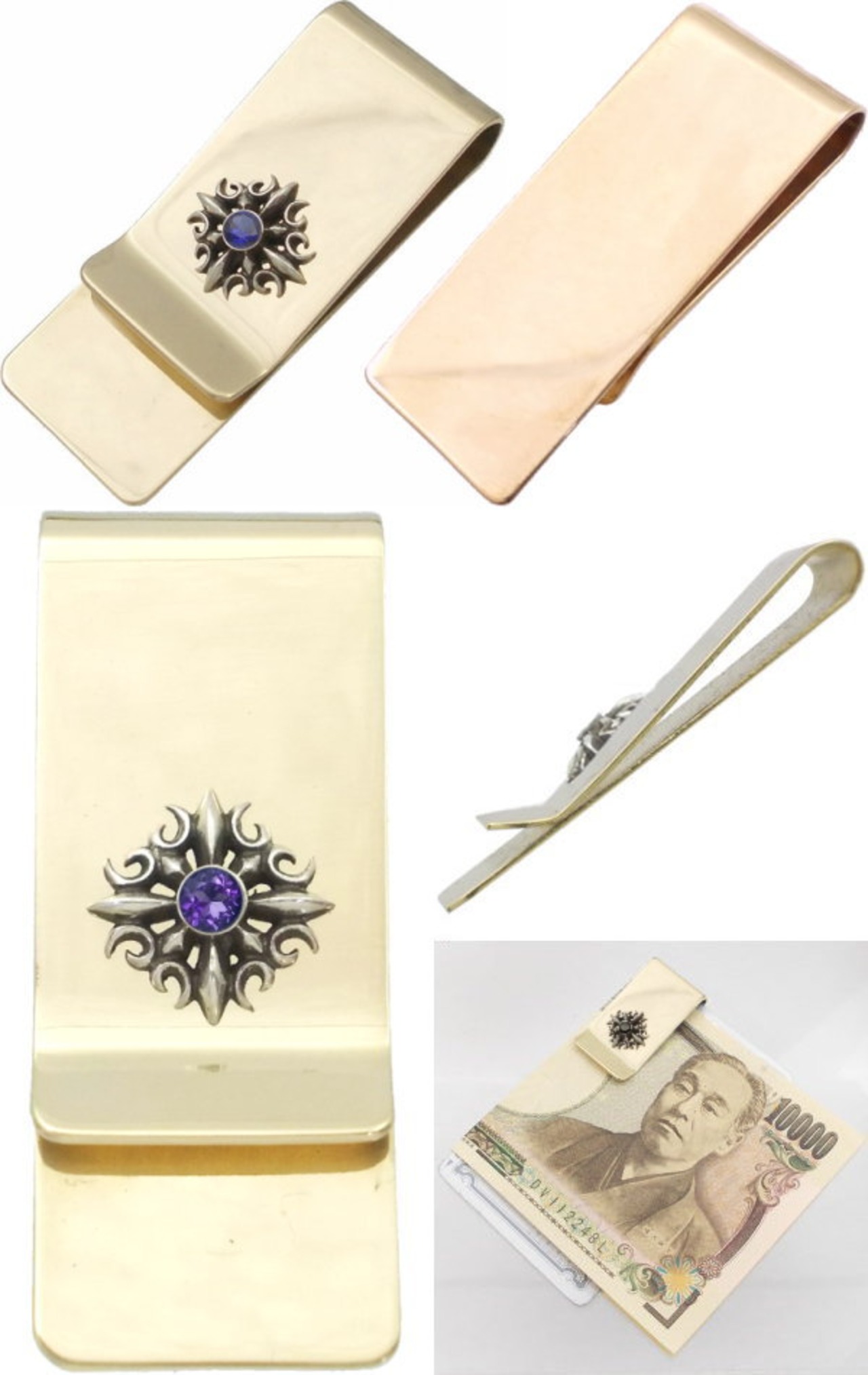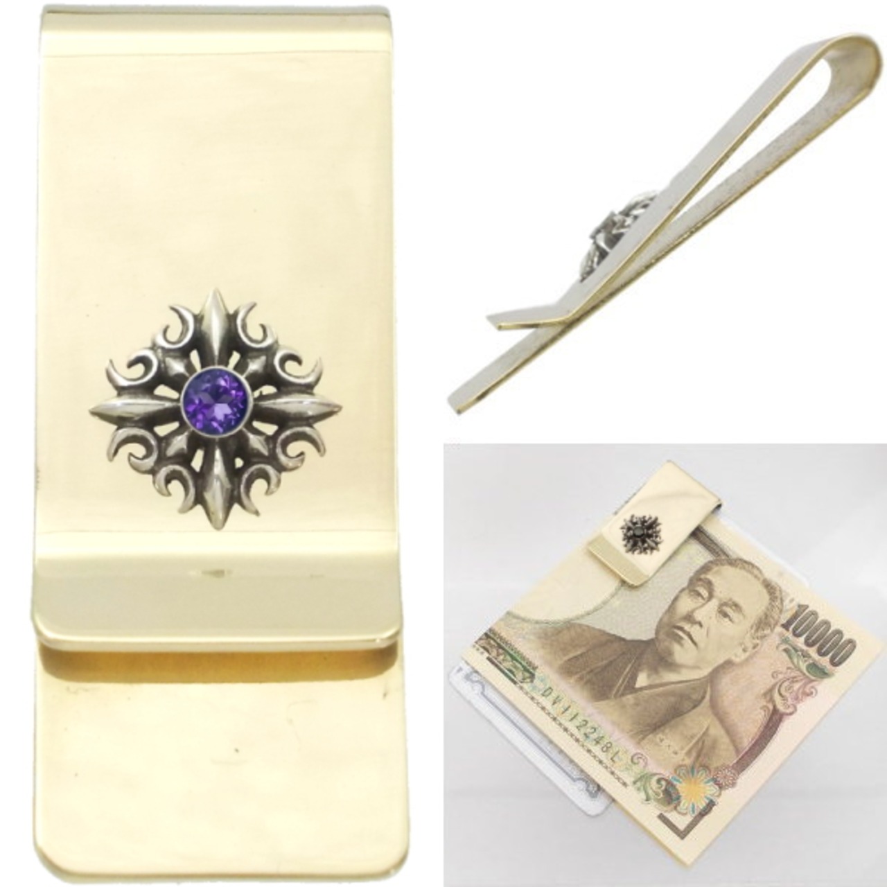 ★シャープなシルバーのクロスに誕生石をセッティングしたブラスマネークリップ。