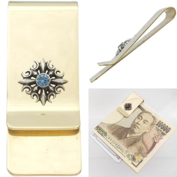 ★シャープなシルバーのクロスに誕生石をセッティングしたブラスマネークリップ。