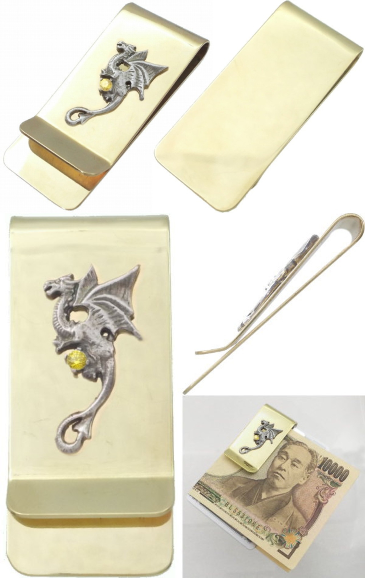★力の象徴ドラゴンに誕生石を含むストーンをセッティングしたブラスマネークリップ。