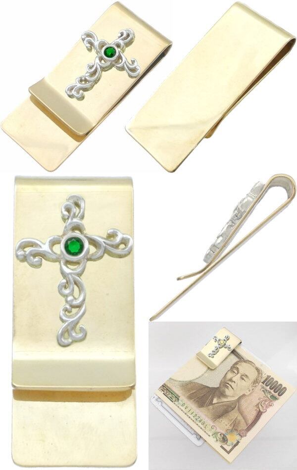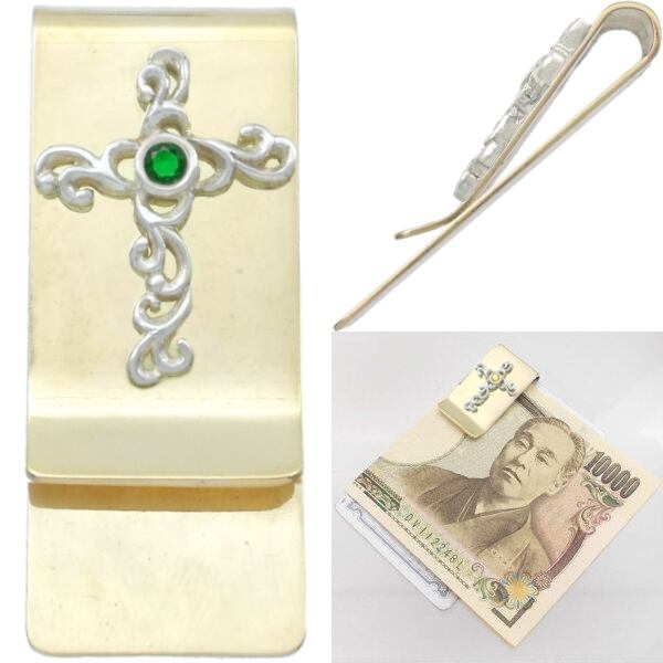 (5月)エメラルドグラス ホワイト アラベスク クロス スリム ブラスマネークリップ 誕生石*BM-1017