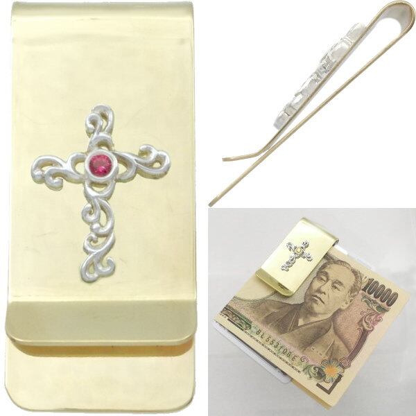(7月)ルビー ホワイト アラベスク クロス ブラスマネークリップ 誕生石*BM-1016