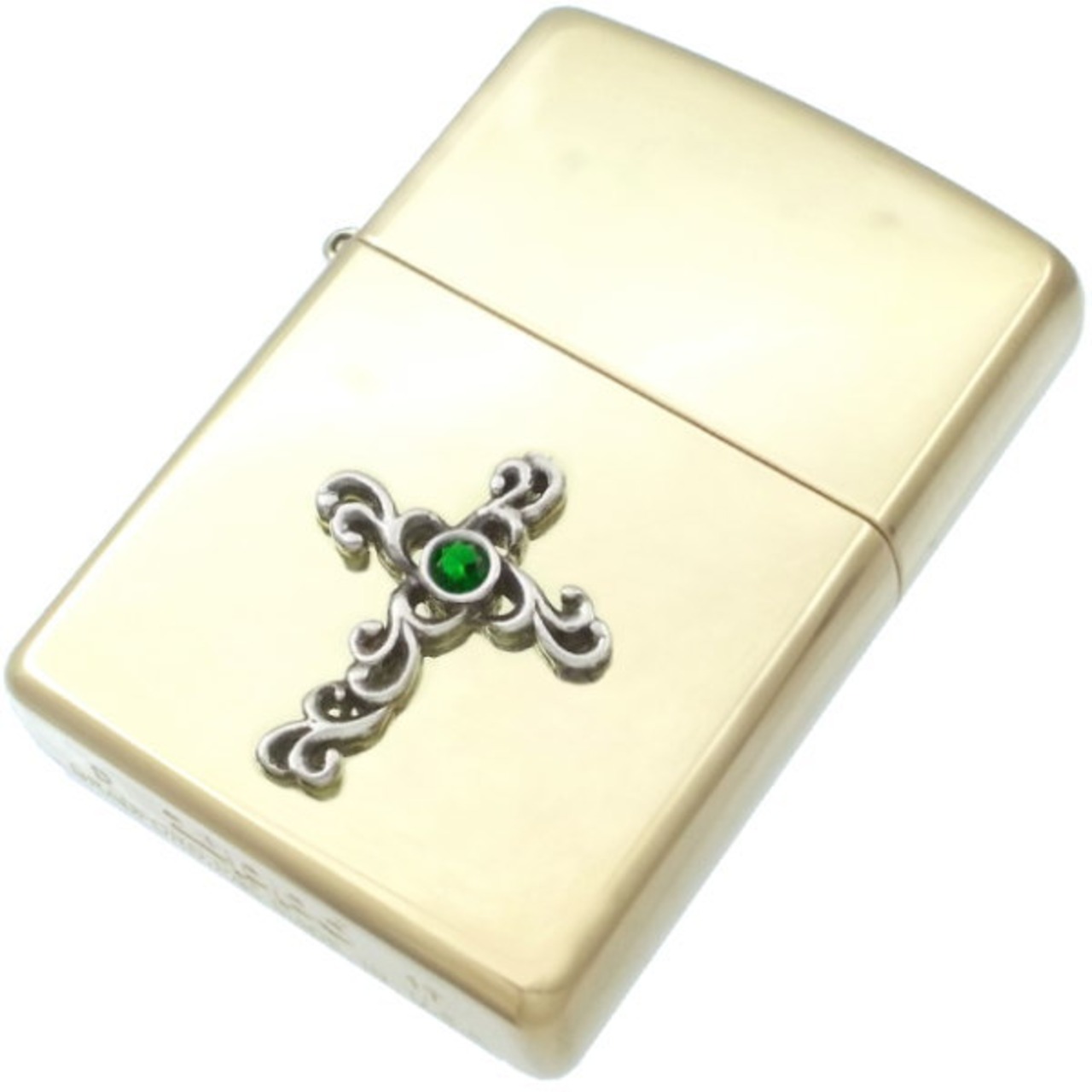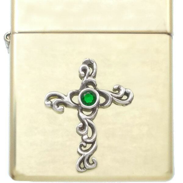 (5月)エメラルドグラス ブラック アラベスク センター クロス ブラスジッポ 誕生石*BZ-1027