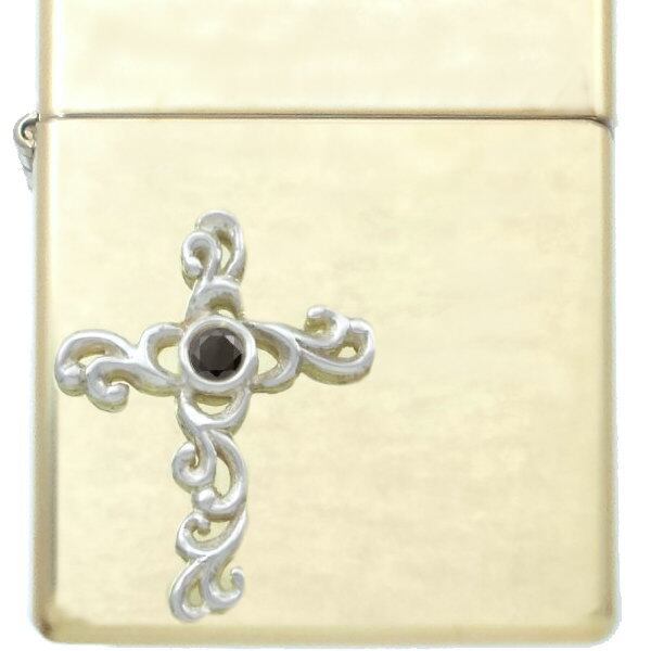 ブラックCZ ホワイト アラベスク クロス ブラスジッポ△キュービックジルコニア使用*BZ-1034