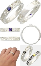 シンプルな唐草デザインに誕生石をセッティングした適度なボリューム感のあるリング。飽きの来ないデザインとホワイトとブラックの仕上げで変わるイメージにも注目。スモールタイプより石との一体感がありシックなイメージ。