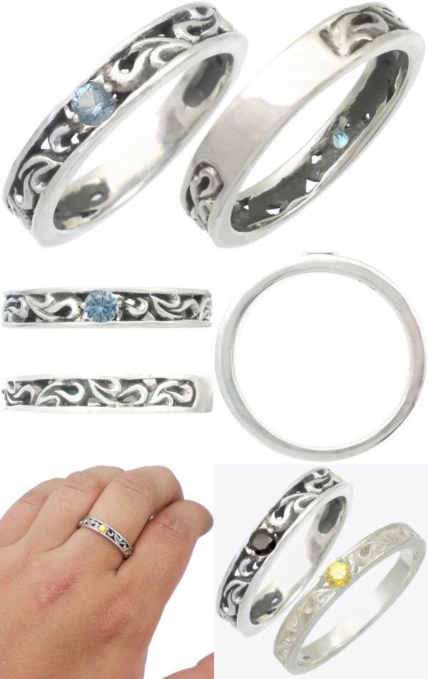 シンプルな唐草デザインに誕生石をセッティングした適度なボリューム感のあるリング。飽きの来ないデザインとホワイトとブラックの仕上げで変わるイメージにも注目。スモールタイプより石との一体感がありシックなイメージ。