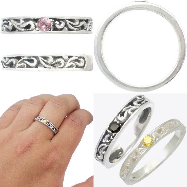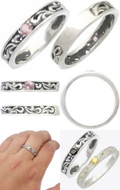 シンプルな唐草デザインに誕生石をセッティングした適度なボリューム感のあるリング。飽きの来ないデザインとホワイトとブラックの仕上げで変わるイメージにも注目。スモールタイプより石との一体感がありシックなイメージ。