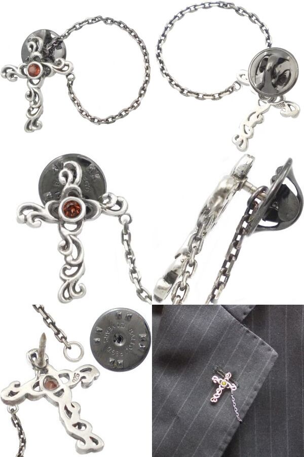 (1月)ガーネット ブラック アラベスク クロス チェーン シルバー ピンバッジ ピンズ 誕生石*BK-1091