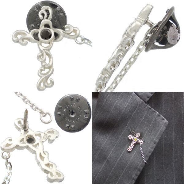 ブラックCZ ホワイト アラベスク クロス チェーン シルバー ピンバッジ ピンズ△キュービックジルコニア使用*BK-1092