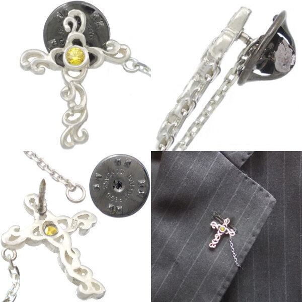 イエローC Z ホワイト アラベスク クロス チェーン シルバー ピンバッジ ピンズ△キュービックジルコニア使用*BK-1092