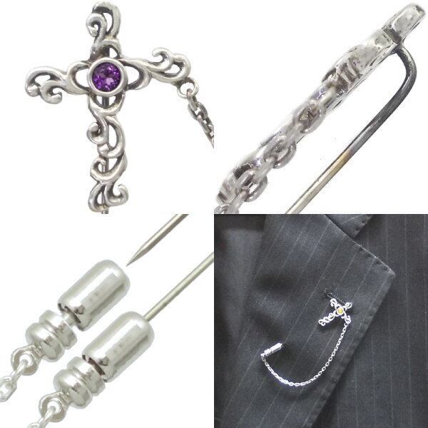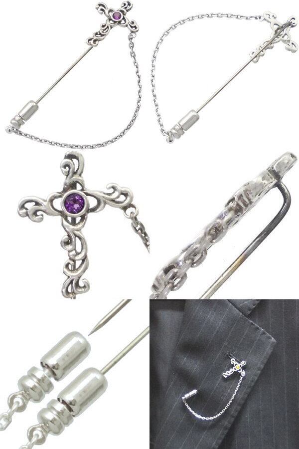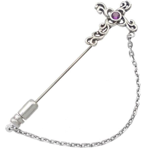 (2月)アメジスト ブラック アラベスク クロス チェーン シルバー ラペルピン 誕生石*BK-1095