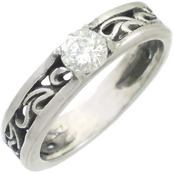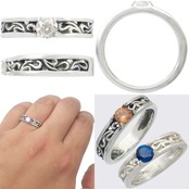 シンプルな唐草デザインに5mmの石をリング幅一杯にセッティング。飽きの来ないデザインとホワイトとブラックの仕上げで変わるイメージにも注目。
