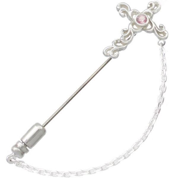 (10月)ピンクトルマリン ホワイト アラベスク クロス チェーン シルバー ラペルピン 誕生石*BK-1096