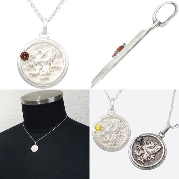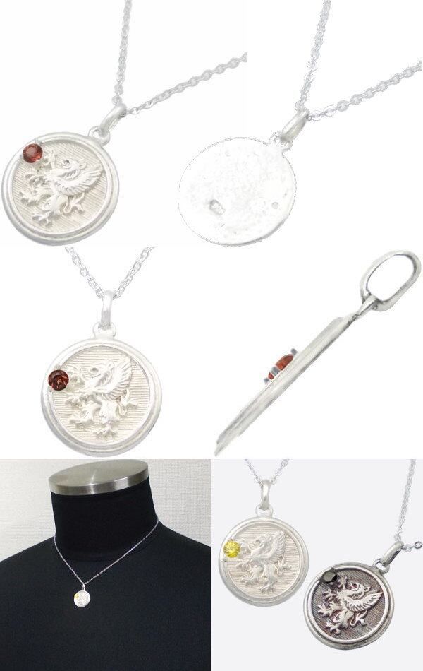 (1月)ガーネット ホワイト グリフォン メダル シルバーペンダントネックレス 誕生石*BP-1046