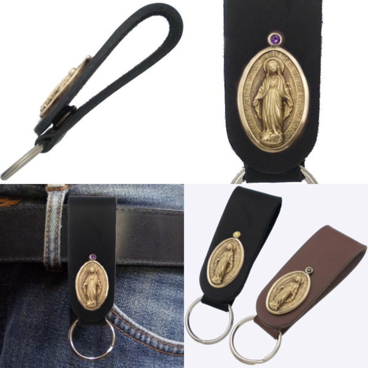 ★アンティーク仕上げの重厚なマリアメダイと誕生石が一緒になったレザーキーホルダー。