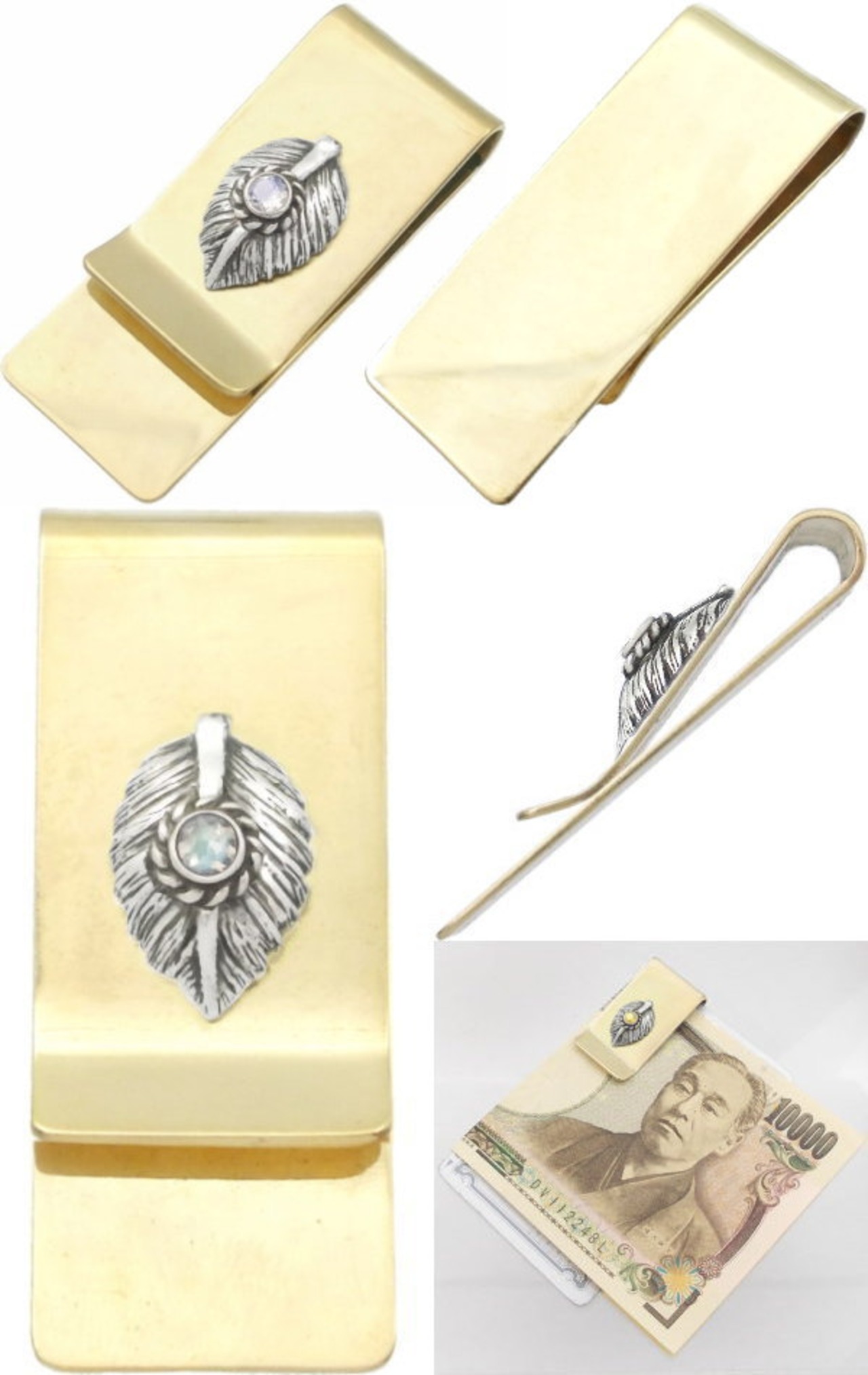 ★鷲の旨の羽「ハート」とハンドメイドの石枠とコンビのブラスマネークリップ。