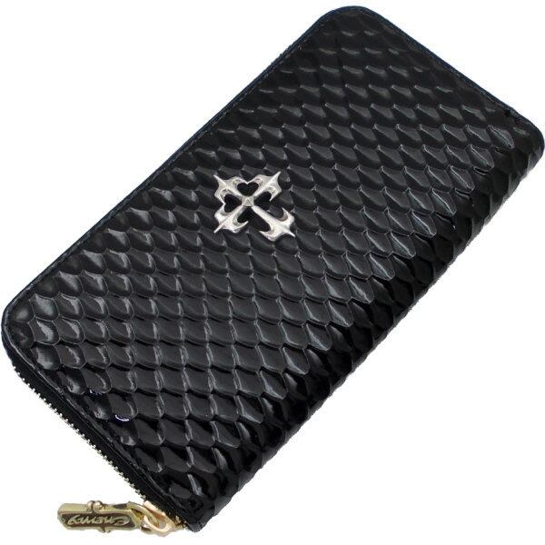 プレス加工では難しい高さのある立体柄が反射するアーバンな妖艶さが魅力のラウンドウォレットはハンドポーチとして使っても◎。ロゴ入りのジッパープルは真鍮製で7gを超えるボリューム。ジッパー付収納も中にありますが外側のジッパーを閉めて使用するならセンターのマチ付ポケットを小銭入れとして使うのもオススメ。