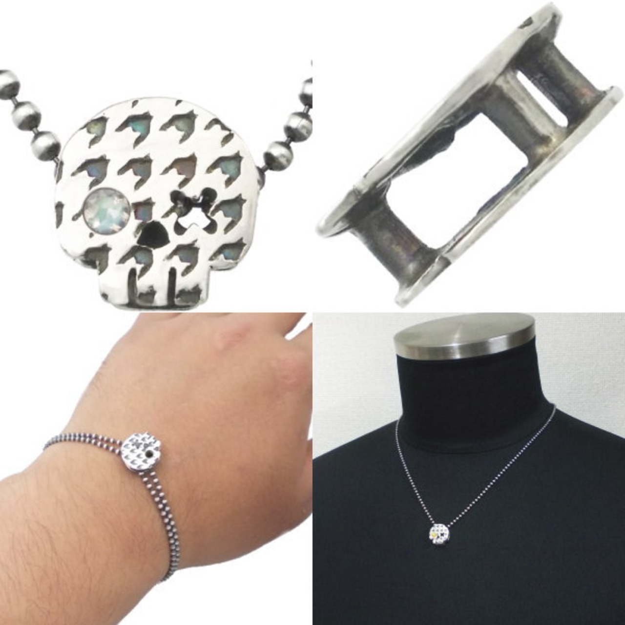 定番の千鳥柄に定番モチーフをアレンジしたシリーズ。トップとして以外にもブレスやキーホルダーから髪留めゴムなど自由な発想で使える工夫がポイント。裏面はスワンキーらしくアナログ感を感じる様にフリーハンドで打刻を施しハンドクラフト感を演出。暖か味のある仕上がりにする為に歯の線や目の×等は糸鋸で切り出しています。
