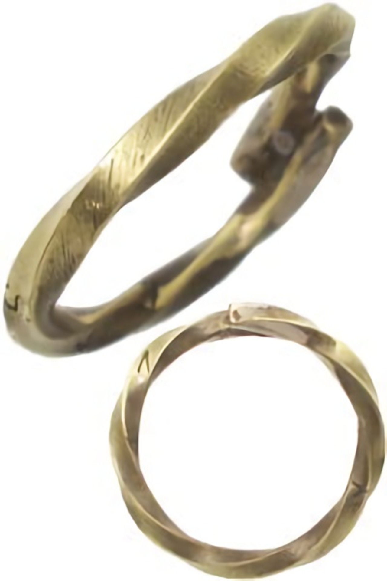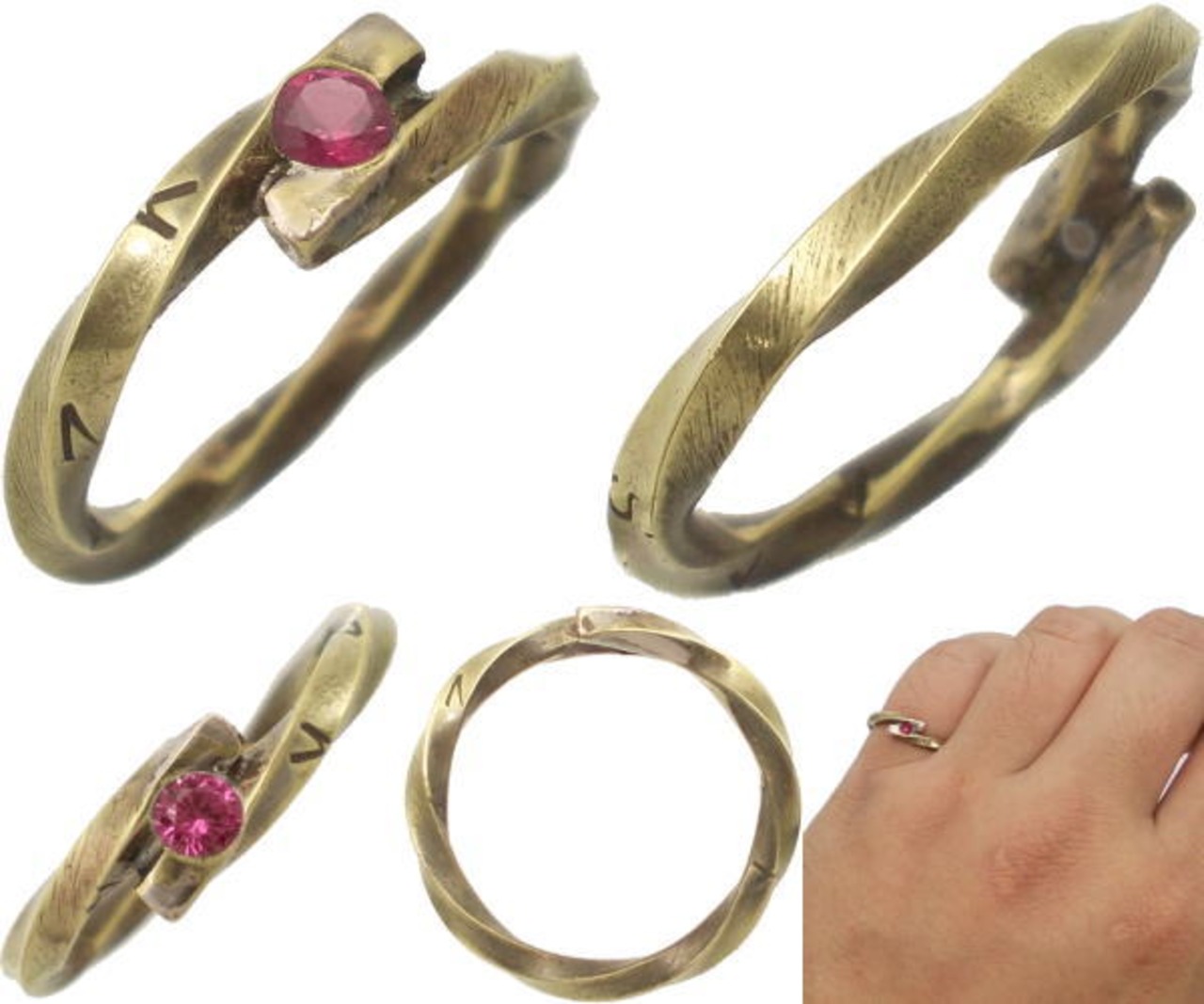 シンプルな中にも見る角度で変わる表情が魅力のツイストリング。通常金色に近い真鍮にクラシカルな雰囲気を醸すアンティークカラー仕上げと手作業でスタンプとヘアラインテクスチャーを施したハンドメイド。