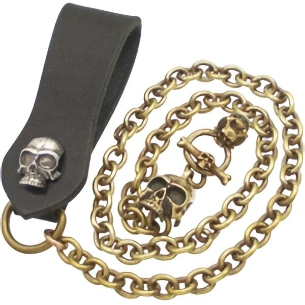 ブラックのサドルレザーにシルバーのスカルコンチョ。キーリング等を介さずウォレットに直結する構造でチェーンとの一体感のあるスッキリとしたシルエットを実現、またTバーによる脱着などの機能面にも注目。