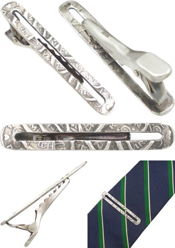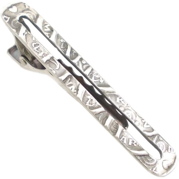 両端のコインノハート模様は活かしつつステンドグラスの様なモザイク模様にアレンジされシルバーらしい燻しの濃淡と相まってクラシカルな深みが魅力。滑り止めも意識した朽ちた様な荒らし仕上げの裏面など枯れた感も秀逸でビジネスシーンにもさり気なく溶け込む大人の気品も感じる。