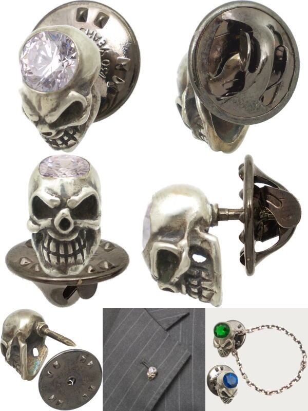 ★迫力の表情のスカルに5mmのストーンをセッテングしたシルバーピンズ。