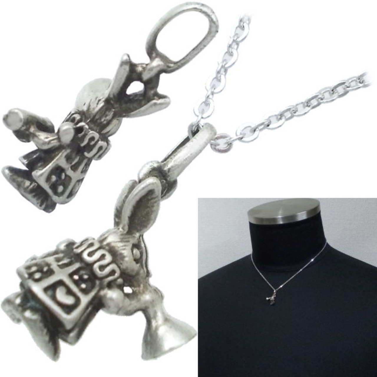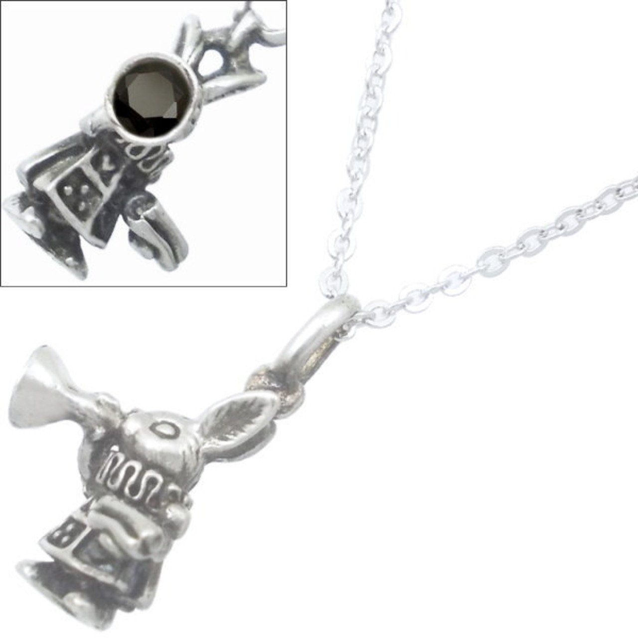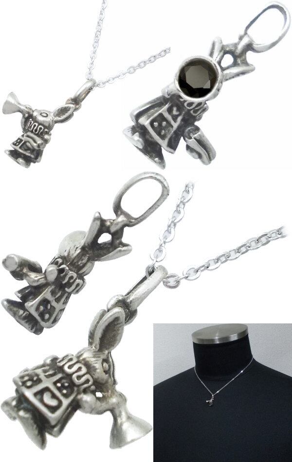 アリスを不思議の国へと誘うウサギがシルバーに!ハートが散りばめられた布告役姿にストーンをセットしたラッパの物語を象徴する姿をデザインしたペンダント。