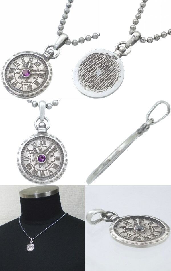 クラシカルなローマ数字のアンティーク ウォッチのセンターに誕生石をセッティングしたペンダントトップ。その他にバチカンの無いレザーコードタイプも有り。