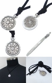 クラシカルなローマ数字のアンティーク ウォッチのセンターに誕生石をセッティングしたペンダント。レザーコードでタイトにもルーズにも使い回せるのも◎、その他スタンダードなバチカンつきのタイプも有り。