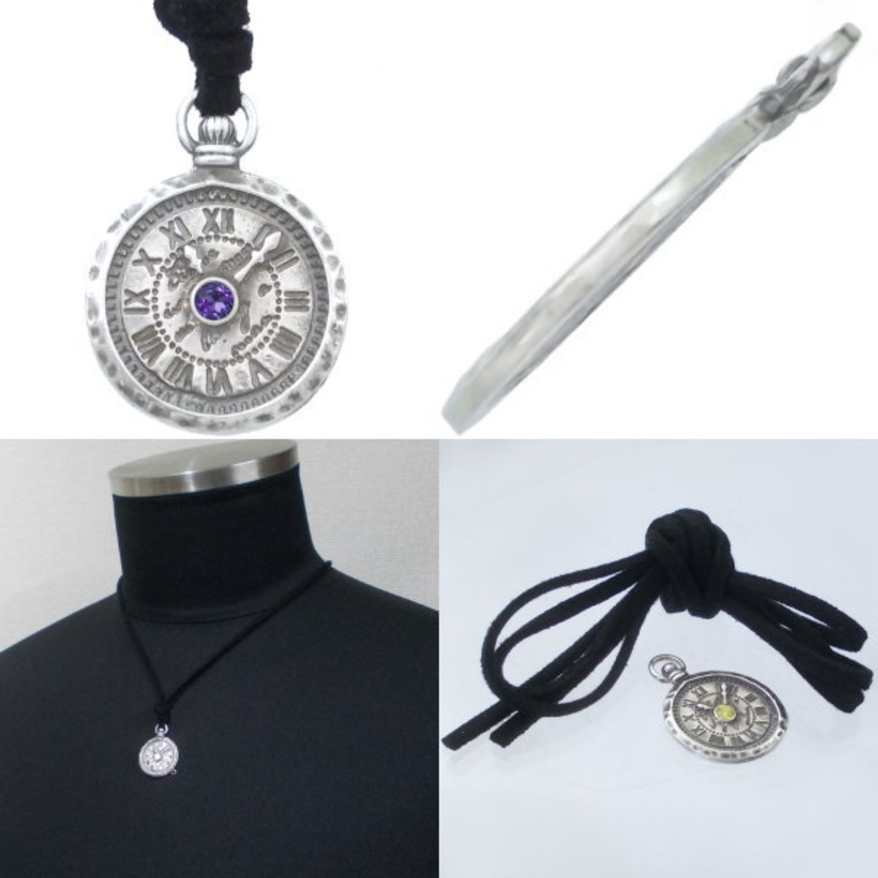 クラシカルなローマ数字のアンティーク ウォッチのセンターに誕生石をセッティングしたペンダント。レザーコードでタイトにもルーズにも使い回せるのも◎、その他スタンダードなバチカンつきのタイプも有り。