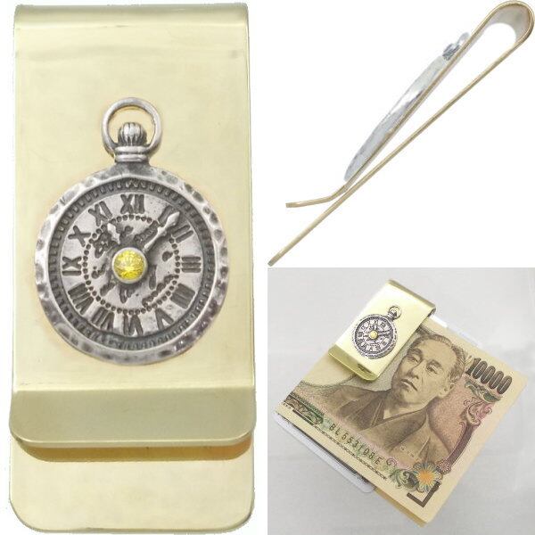 ★落ち着いた雰囲気のシルバーの懐中時計と誕生石のさり気ないブラスマネークリップ。