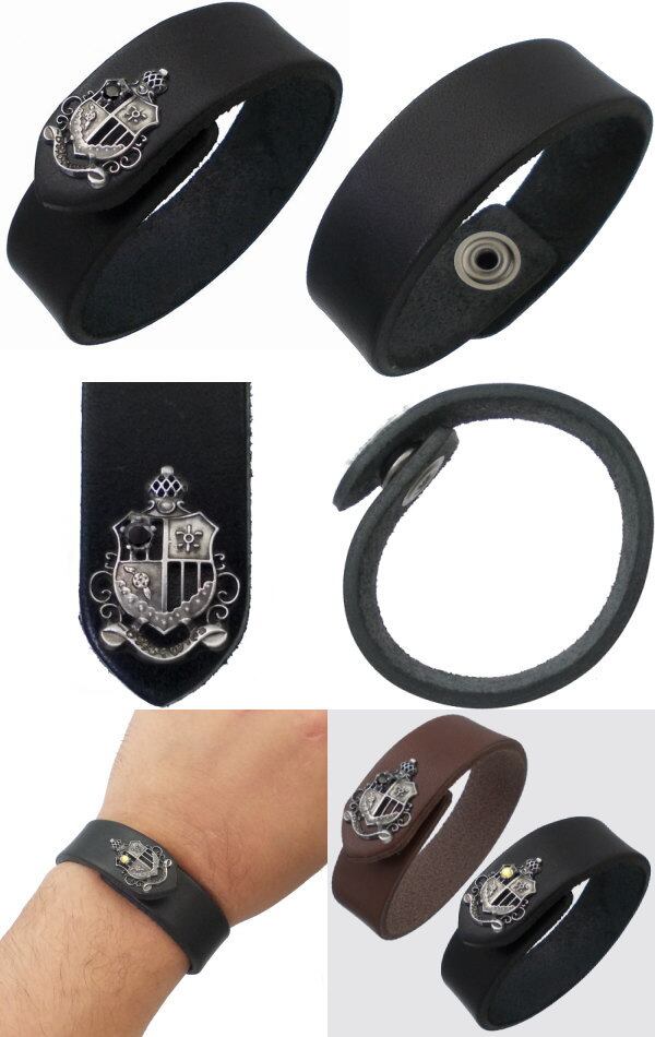 ブラックCZ シールド エンブレム ブラックレザー ブレスレット*BB-1021