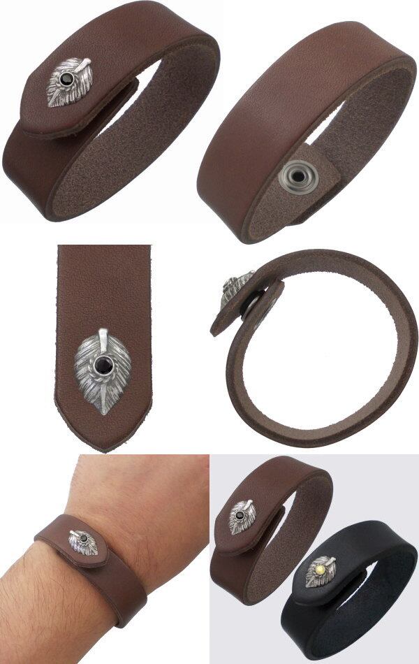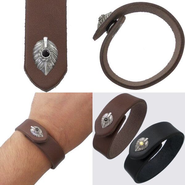 ブラックCZ ブラック ネイディブ ハート フェザー ブラウンレザー ブレスレット*BB-1025