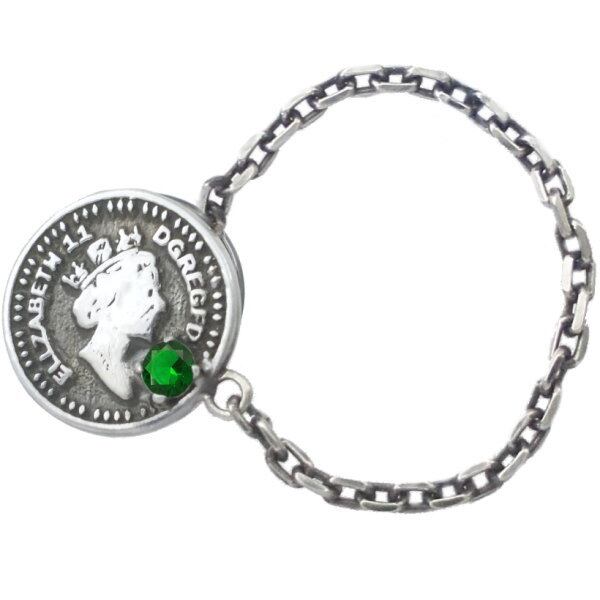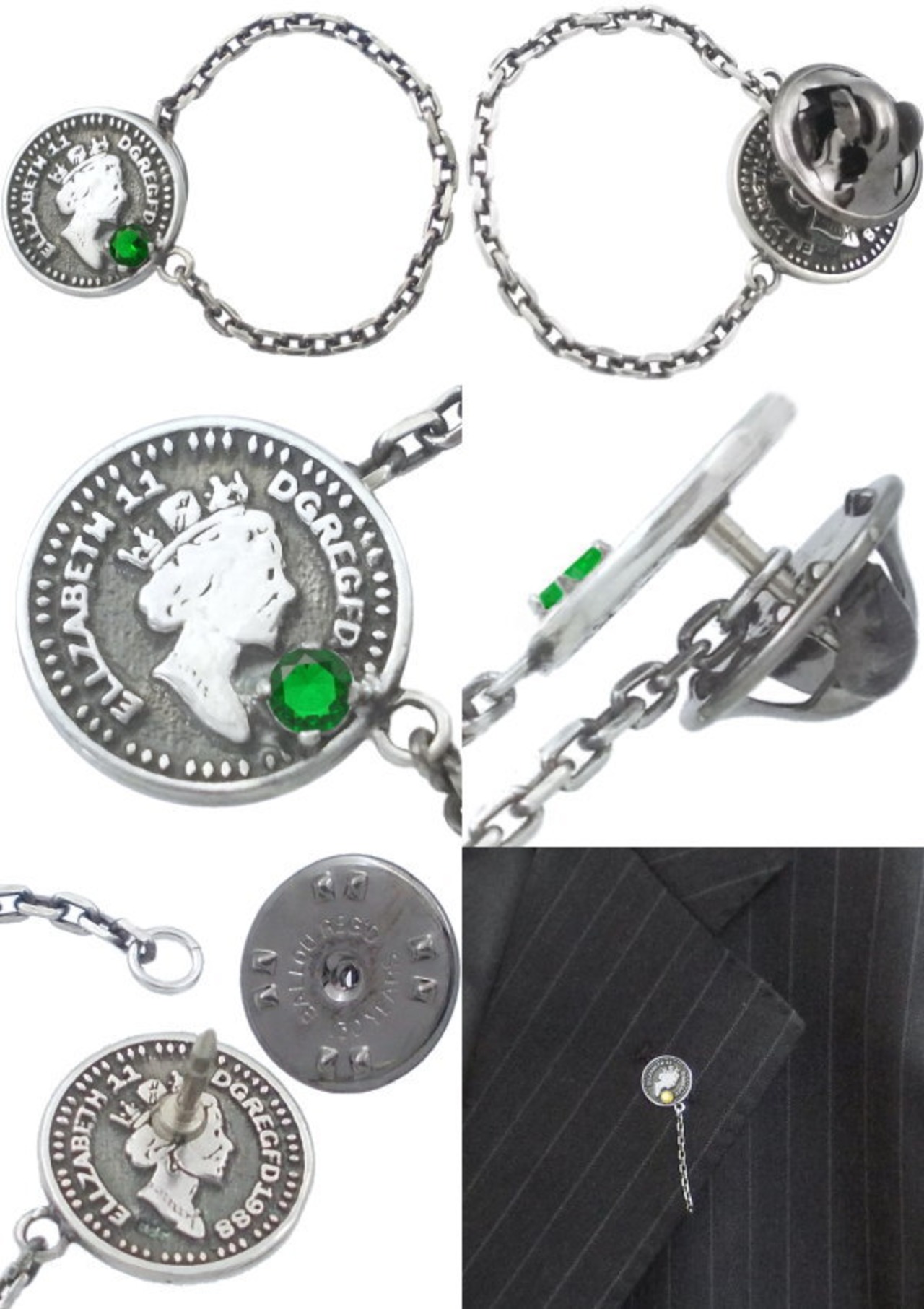 (5月)エメラルドグラス ホワイト ブラック エリザベス コインチェーン シルバーピンバッジ ピンズ 誕生石*BK-1119