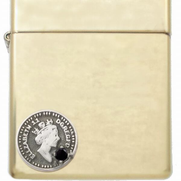 ★エリザベス女王のシルエットの小さめコインモチーフがワンポイントのブラスボディジッポ。
