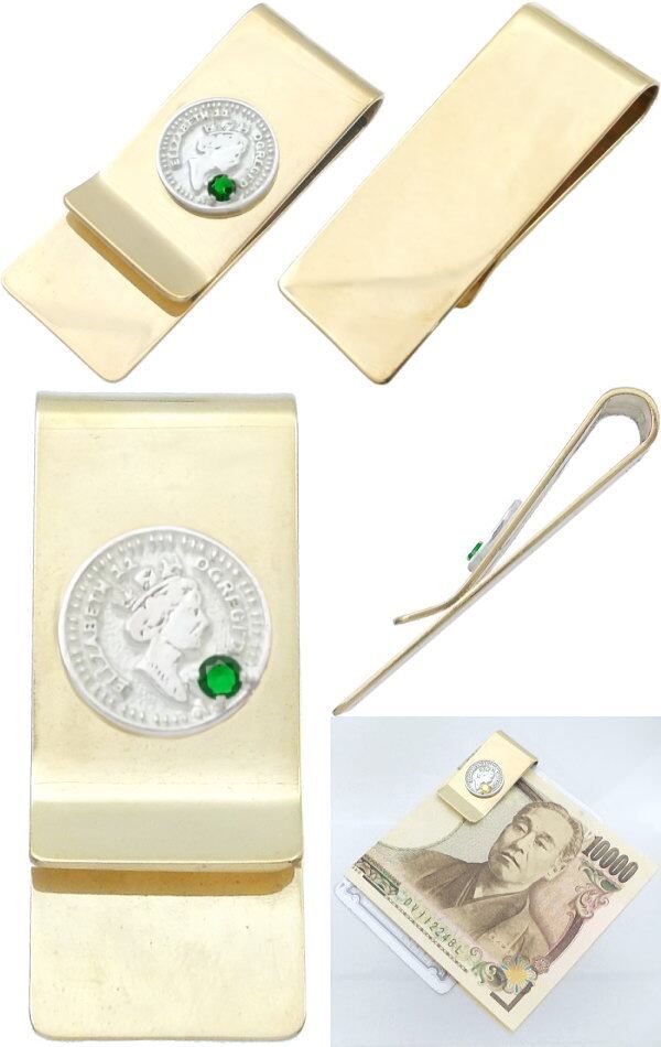 (5月)エメラルドグラス ホワイト エリザベス コイン スリム ブラスマネークリップ 誕生石*BM-1035